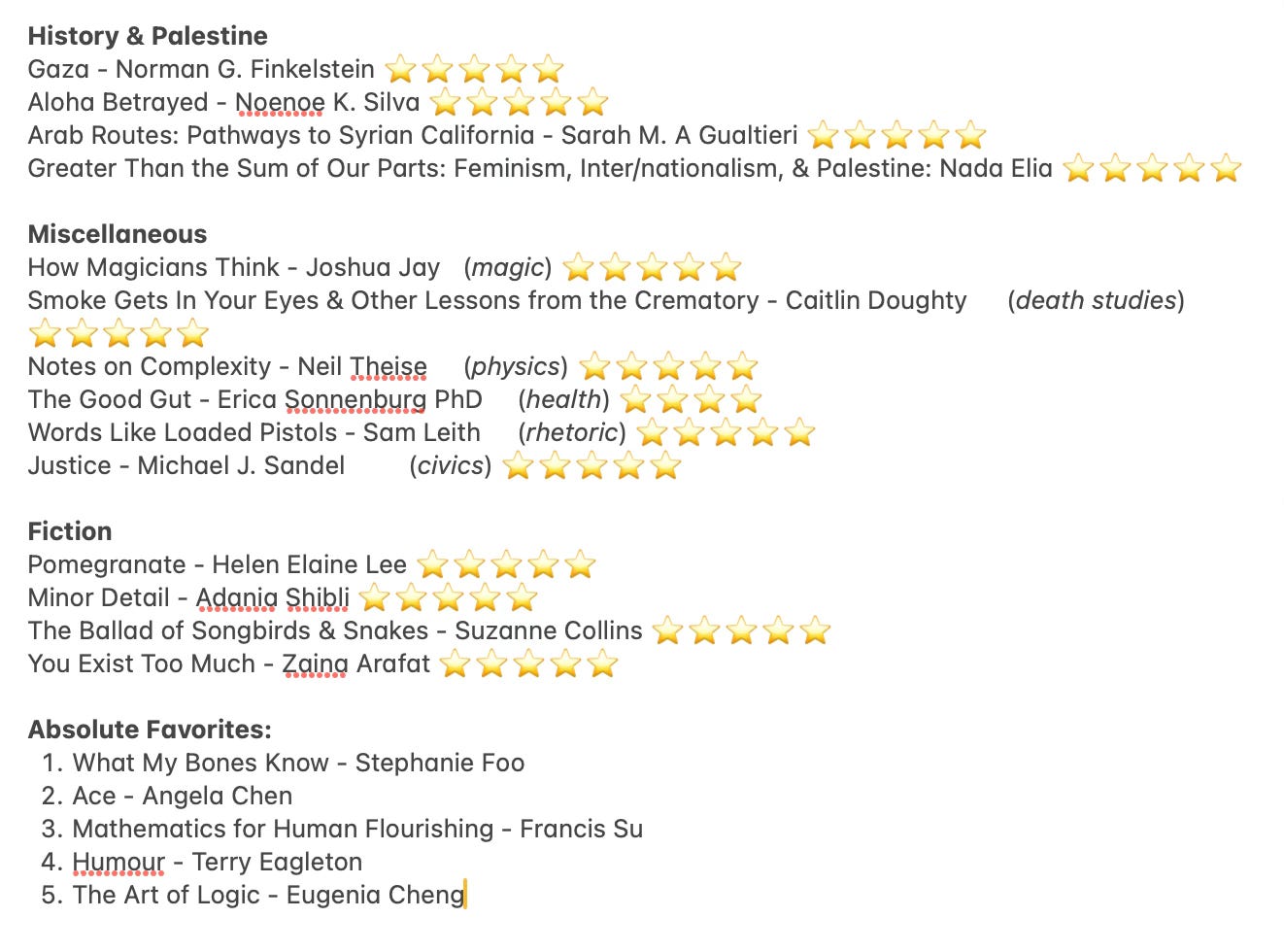 I made a list of my top five at the end, they are all non-fiction but if you were to ask me my favorite fiction book from this year it’d be Pomegranate by Helen Elaine Lee (TW: addiction, SA).